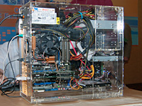 このほか,CPUの近くに2か所の切り欠きがあるのが気になったので聞いてみると,一言「開発中」という答えが返ってきた。何らかのパイプなりなんなりを通せそうで,COMPUTEX TAIPEI 2006で展示されていた水冷ユニット(の改良版)が思い当たるが,ユー氏にいろいろ聞いてみたところ,水冷の可能性もゼロではないものの,何か別の冷却機構を考えており,これはそのためのものであるかのような口ぶりだった。少なくとも,COMMANDOが発売されるタイミングで明らかになることはなさそうなので,気長に待ちたい。