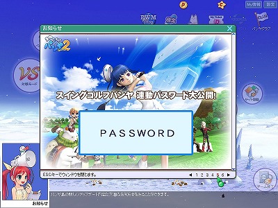 PC版「スカッとゴルフ パンヤ」のゲーム内お知らせページで入手できるパスワードを,Wii版「スイングゴルフ パンヤ」で使うと,オリジナルコスチュームをもらえる