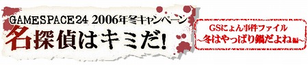 ゲームポータルサイト「GAMESPACE24」で,「名探偵はキミだ! 〜冬はやっぱり鍋だよね編〜」と題したキャンペーンが開始された。実施期間は,本日(12月20日)0:00AMから2007年1月10日11:59PMまで。 このキャンペーンの特設ページには,闇鍋を楽しむGAMESPACE24運営スタッフを襲った,悲劇(?)のストーリーが掲載されている。“GS24面相”が,運営スタッフの一人になりすまして闇鍋に参加し,何かとんでもない具を鍋に投入したというのだ。GS24面相が示したヒントをもとに謎を解き明し,GS24面相が誰になりすましているかを当ててみよう。