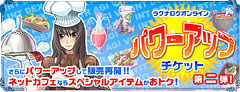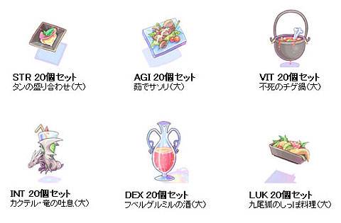 ガンホー・オンライン・エンターテイメントは,MMORPG「ラグナロクオンライン」で利用できるネットカフェ限定商品「ラグナロクオンライン パワーアップチケット」の新版である料理アイテムチケットを,2006年12月21日3:00PMから2007年1月22日の間,一部(約100店舗)のラグナロクオンライン公認ネットカフェで販売する。 今回の料理アイテムは6種類用意され,それぞれSTR,AGI,VIT,INT,DEX,LUKのステータスが30分間+10されるという効果を持つ。ゲーム内でShop Point(1Shop Pointは0.1円相当)を利用して購入できるスペシャルアイテム(ステータスアップ系)と同様の効果を持っているにもかかわらず,同じ金額で倍の個数買えるのが独自のメリット。ゲーム内で購入するスペシャルアイテムは300円相当で10個となっているが,こちらのチケットの希望小売価格は税込み315円で,パワーアップアイテムが10個入った箱アイテムのチケットIDが二つついてくる。なお,アイテムの内訳は以下のとおり。