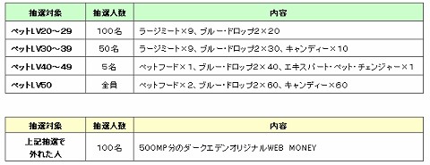 【各説明】 (1) 戌年ラストを記念して、ペット関連サービスとプレゼント実施! ダークエデンのペットは、死にやすく成長速度もゆっくりであるため、プレイヤーにとって育成は簡単なものとは言えません。 そんなペットを育成しているペット愛好家の方々に感謝をこめ、そして、戌年最後のイベントとして、「ペット関連のサービス」と「イベント」を行います。