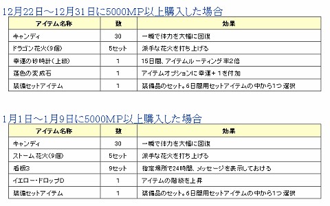 (2) アイテムショップで5000MP 以上の購入者の全員に4000MP 相当のアイテムセットプレゼント! 一定期間内にアイテムショップで5000MP以上購入した方全員を対象に4000MP相当のアイテムセットをプレゼントします。期間は、年末と年始の2回あり、それぞれプレゼントの内容は異なります。どちらの期間とも条件を満たせば、両方のセットアイテムをプレゼントします