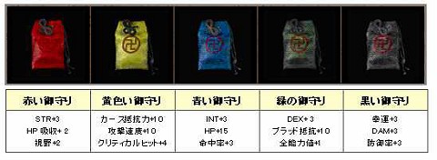 ※御守アイテムは時間制アイテムなので、獲得後ログアウトすると自動的にインベントリから消えてしまいます。 ※御守アイテムは1 つしか持つことができません。(インベントリに十分な空き容量がない場合は拾えません。) ※捨てたり、他のキャラクターと取引したりすることもできません。 ※ショップNPC にて販売することができます。