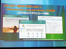 またジェイミソン氏は,「Windows Vista Upgrade Advisor」の日本語版を,1月30日に公開するとも発表した。Windows Vista Upgrade Advisorについては2006年12月27日の特集記事が詳しいが,簡単にいえば,手持ちのPCでWindows Vistaが動作するかどうかをチェックできるツールだ。いますぐWindows Vistaを導入するつもりがなくても,将来的にOSの入れ替えを予定しているのであれば,日本語版を入手してみてはどうだろうか。マイクロソフトによれば,1月30日にはダウンロードページが公開される予定となっている(※1月15日時点で,リンク先にページは用意されていません)。