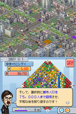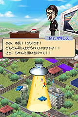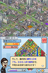 2画面というDSの特徴を利用し,上は斜め見下ろし型の画面で見た目を重視し,下は,タッチペンの使用が可能な作業画面にして操作性を重視する。ビギナーでも簡単にゲームが遊べるように,プレイヤーをサポートする5人のキャラクターが用意され,町が発展するにつれ発生するさまざまな問題に対してアドバイスをくれるのである。アドバイザーの中には,ヒゲとメガネとヒョロリとした体つきがある人物を想像させずにいられないキャラクターもいるが,ウィル・ライト氏ではないということなので,お間違えなきよう。 また,腰をすえてゲームに取りかかるPCユーザーと違い,携帯ゲーム機での1回のプレイ時間は短いと想像されるため,ゲームに刺激を持たせるイベントが多数発生するようになっている。例えば,人口が5000人を突破すると市長官邸の建設が可能になり,市長官邸を建設すると,12月24日にサンタが町にやってくる。このサンタをタッチペンで叩くと(叩くのはどうかと思うが),素晴らしいプレゼントを落としてくれる,といった感じだ。各イベントはミニゲーム仕立てになっているが,「ゲーム内で別のゲームをさせるのは好まれない」という理由で,いずれもごく簡単なものになっている。 さらには「ミッションモード」も用意され,これは「台風の直撃で破壊された電力網を復旧する」とか「破綻した財政を立て直す」などなど,町の抱える問題を解決するミッションクリア型のモードだ。そして,このミッションをクリアすると日本版ならではのランドマーク,「お城」が手に入るのだ。お城は47都道府県それぞれに用意され,城趾しかないものは各種資料を使って復元したという気合の入れようである。 それ以外にもさまざまな要素が追加され,シムシティのゲーム性はそのままに,NDSならではのアトラクションを付け加えたという印象が強い。