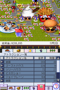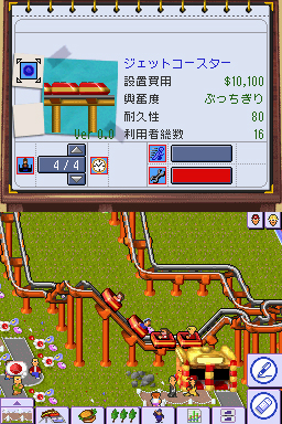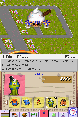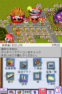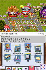 カリスマクリエイターのピーター・モリニュー氏と彼の率いるスタジオ,ブルフロッグが,最も脂の乗っていた時期(1995年)に発表した傑作箱庭系シミュレーション。プレイヤーは遊園地のオーナーとなって,スタッフを雇いライドを設置し,さらには株の売買や労使交渉(!)なども行って千客万来のテーマパークを造り上げ,遊園地王を目指すというもの。 NDS版には,シムシティ DS同様,4人のアドバイザーが用意され,とくにビギナーにとって,どうしていいか分からなくなりがちなこの手のゲームを親切に指導してくれるのだ。とかく,こうしたアドバイザーは同じようなことを繰り返す“うざい”存在になることが多いが,そういう点には十分に留意し,まさにかゆいところに手が届くような存在であるとのことだ。したがってテキスト量は膨大で,しかも驚いたことに6か国語対応というグローバル仕様になっている。ちなみに,開発したのはエレクトロニック・アーツのジャパンスタジオである。 NDS版を制作するにあたり,新規ショップやキャラクター,そして新しいライドなどをできる限り増やし,また「自分のテーマパークを世界中にオープンして世界制覇」という目的がはっきりしたクリア型のゲーム展開に変えて,PC版になじみのない人にもアピールしている。いろいろなタイクーンシリーズに続いていく原点ともいえるこのゲームをもう一度,ちょっと違ったアレンジでプレイできるのは楽しみだ。