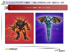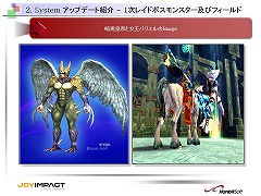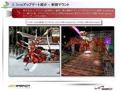 また新マウントとして,「スヴァディファリ(仮称)」「スレイプニル(仮称)」「レッドドラゴン(仮称)」の投入も決定している。それぞれ,機動力や力,移動タイプなどに特徴がありそうだが……,こちらに関しても,続報を期待したいところだ。 なお,韓国取材中,JoyImpactでWYD2の企画/サーバープログラムを担当している開発者から,2007年の長期計画に関するコメントを頂けた。のちほど掲載予定の大会レポート記事で,そちらもお伝えするので,WYD2プレイヤーは楽しみにしていてほしい。