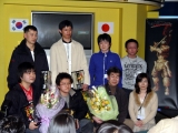 ハンビットユビキタスエンターテインメント マーケティングチームの平田雅一氏(左から2番目)から激励を受ける,E・ROMANのメンバー達