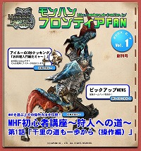 「モンハンフロンティアFAN」では,狩りに役立つ攻略記事,モンスターハンターシリーズ初心者向けの記事,新着情報などが掲載される。そのほか,「肉焼き占い」といったFLASHコンテンツや,プレイヤー参加型の投稿コーナーなども設けられる。