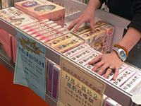 ここで特徴的なのは,攻略本とゲームパッケージのセットだ。台湾のゲーム攻略本は分厚いデータブックであって,これをメーカー自らゲーム本体と一緒に売るのは,マッチポンプな気がしないでもないのだが,例えばほかの物販専門ブースで630NT$(約2300円)で売られている作品が,攻略本付きで800NT$(約3000円)くらいだったりして,それなりにお買い得感はあるようだ。また,歴代作品をセットにしたものやら,フィギュア入りの限定パッケージやら,同じソフトでも実に多種多様のパッケージが取り揃えられている。 ぱっと見たところ20代,30代くらいの人が多いなど,学生/生徒の比率が高いビジネスデイの風景としてはいささか年齢層が高く,同社製パッケージソフトの愛好層の姿が垣間見える気もしたが,品定めする来場者は途絶えない様子だった。