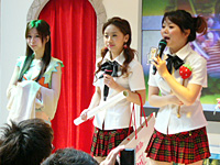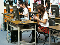 この学園という設定に合わせて,ブースのコンパニオンはすべて赤いチェックのミニスカートと白いブラウス,黒いハイソックス姿をしており,来場者は試遊台のある教室内で彼女達からレクチャーを受けつつ,新作のプレイを学べるわけである。 とはいえ,窓側からよくよく見ていると,試遊台のPCで関係なさそうなblogサイトを見ているカップルがいるなど,全体の雰囲気はまったりしたもの。まあこれはこれで,ある意味教室というモチーフに似つかわしい風景でもある。