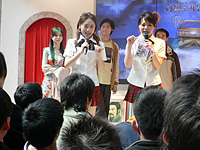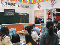 Angel Love Onlineの展示スペースについては,別途記事があるので割愛するとして,Taipei Game Showで強いファンサービスの側面を体現するのが,試遊台を集めた「UJ熱血学園」である。学校の教室に似せて作られた,窓と黒板と机のスペースに,新作の三国群英大富翁や近作の「幻想三国誌3」などが試遊できるPCが30台程度設置され,時間を区切ってイベントなども行われている。黒板に書き出された時刻にステージ前に集合し,27位までの「模範生」にノベルティグッズが贈られるといったものだ。