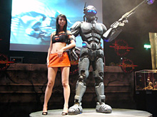 ステージの両脇からブース内部に入ると,プロモーションムービーのスクリーンとフィギュアコーナーがあるが,ここでは等身大よりやや大きなプレイヤーキャラクターのフィギュアがあり,その横でコンパニオンのお姉さんがポーズをとっている。そこから進むと武器コーナーがあって,主にプレイヤーキャラクターが使う重火器や剣のオブジェが用意されている。ここのコンパニオンさんは剣を構えて,来場者と一緒に写真に収まってくれる。