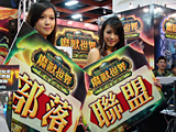 商談の場というよりは,ゲーマー向けのアピールの場であるTaipei Game Showの性格にふさわしく,来場者にゲームのイメージを強烈に植え付けることに,主眼を置いたようである。会場随一のブース面積を生かした,58台(うち4台は30インチクラスのワイド液晶ディスプレイだった)もの試遊台とて驚くには十分だが,このブースはトータルコンセプトにおいても,一見の価値あるものだった。