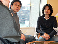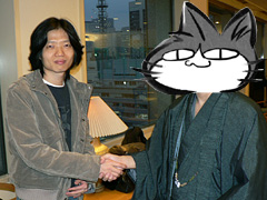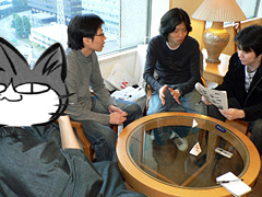 いかにも「撮影のために握手してもらった」という写真だが,このポーズをお願いしたきっかけは,本物(?)の握手である。(青森県在住で,めったに上京しない)李さんが,(韓国から来日していた)開発スタッフの二人に対して「こうやって直接会うことは,もうほとんどないと思うので」と言って片手を伸ばし,二人も快く応じて握手していた