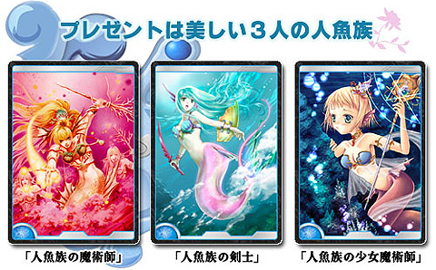 ◎キャンペーン概要 対象:1) キャンペーン期間中に「アルテイルネット」にて500グラン以上のGASH課金をした方全員 2) キャンペーン期間中にGASHから「アルテイルネット」の会員登録をした方全員 期間:2007年2月26日(月)12時〜3月12日(月)12時まで 賞品:1) グラン購入に使用したGASHポイントに対してGASHポイントを3%返還! 2) 1アカウントにつきゲーム内カード3枚プレゼント:「人魚族の剣士」、「人魚族の魔術師」、「人魚族の少女魔術師」