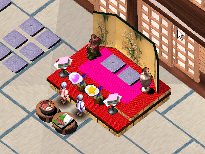 雅(みやび)祭りとは、女の子の健やかな成長を願うお祭りで、屏風を立てた赤い壇に男の子と女の子が並んで三色の餅を食べるという鴇羽国の古い習慣が元になっています。