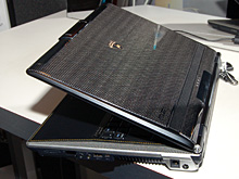 左はカーボンブラックモデルの概観。右はキーボードとパームレスト部を拡大したもの