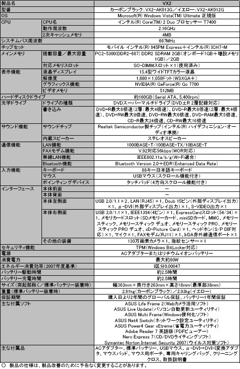 CPUはCore 2 Duo T7400/2.16GHz,メインメモリがPC2-5300 DDR SDRAM 1GB×2,HDD容量160GBというのは従来モデルとまったく同じ。本体カラーがイエローとブラックの2色なのもこれまでどおりで,イエローの天板は48時間もの時間をかけて4層コーティングされ,実車のそれに近い軽さと強度を持っているとされるのも同様だ。ただし,ブラックモデルに関しては,カーボン(炭素繊維)が織り込まれ,いかにもカーボン調という外観になった。また,パームレストがVX1 Golden Editionのアルミからレザーになったことや,130万画素のWebカメラを内蔵したのも特徴といえる。