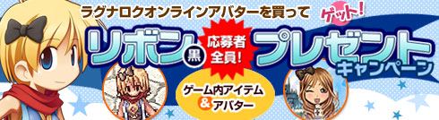 本キャンペーン期間中、ラグナロクオンラインアバターアイテムを700コイン(700円)以上ご購入いただいた方、もれなく全員にゲーム内アイテム「リボン(黒)」をプレゼントいたします。
