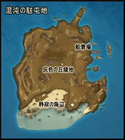 ■「混沌の駐屯地」マップ □位置:プリストン大陸の最南「リカルデン」から南東の海上に位置 □移動手段: 1.リカルデンタウンの街中にいる「ワープゲートの発明家」NPCからのクエストをクリアし「エクストリームウィング」を入手。 2.「エクストリームウィング」をもったまま、ワープゲートで利用料金4000Gを支払うと「混沌の駐屯地」へ移動可能。