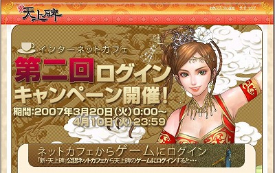 <以下,メーカー発表文の内容をそのまま掲載しています> 株式会社ゲームオン[本社:東京都渋谷区、代表取締役社長:李相 ■※(イ・サンヨプ)]が運営するMMORPG(Massively Multi Player Online Role Playing Game / 多人数参加型オンラインロールプレイングゲーム)『新・天上碑』では、正式サービス4周年を記念して、2007年3月20日(火)0:00〜4月10日(火)23:59まで、「インターネットカフェ第二回ログインキャンペーン」を実施します。 「インターネットカフェ第二回ログインキャンペーン」は、期間中に、全国のゲームオン公認ネットカフェで『新・天上碑』をプレイすると、その合計時間に応じて、ゲーム内アイテム【逆天符】と【天后内丹】をもれなくプレゼントします。さらに、その中から抽選で計5名様に、プレイ時間に応じて【守護神牌】を差し上げます。 賞品となる【逆天符】はステータス成長率:2倍、【天后内丹】体力回復量:30000の効果があり、プレイ時間が長いほど、プレゼント数が増えていきます。また、抽選となる【守護神牌】は、装備すると、それぞれ装備した守護神(青龍/白虎/朱雀/玄武)に応じた成長促進効果があります。 同キャンペーンは、2006年10月に第一回を実施し、大変好評をいただきました。今回は、お客様のご要望にお応えし、第二弾となります。 「インターネットカフェ第二回ログインキャンペーン」実施概要