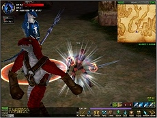アレスオンラインは,さまざまな規模の対人戦闘を中心としたRPGとなっており,キャラクターはアライアンス,エンパイアの2か国いずれかに所属し,ギルドとギルド,国と国単位の大規模な戦闘も行われるようになる。 今回の撮影に使用したキャラクターの所属国はエンパイア,クラスはナイトで,序盤のダンジョンでの戦闘シーンをまとめてみた。2本ムービーを作ってみたが,低レベルナイトの戦闘は通常攻撃とスキル2種類くらいと,いま一つ地味なので,どちらも代わり映えはしない。申し訳ない。ウィザードなどは範囲攻撃でバリバリと突き進んでいるのを見ると,ムービー撮影用にはもっと派手そうなクラスを選んでおくべきだったかと反省。装備が少し変わっているので,そのあたりのグラフィックスを確認していただきたい。 GeForce2 MXでも動くという軽いグラフィックスなので過大な期待は禁物だが,意外なことに登場するモンスターはかなり大型で,画面内に多数登場してくる。初期マップでこそほとんどリンクしてこないが,序盤マップでも,すぐにほとんどのモンスターがリンクしてくるようになる。 操作系にややクセがあるもののゲーム内容はシンプルで,少なくとも序盤は,強引にいけばサクサク進めるゲームだ。3日間ほどのプレイだったので肝心の対人戦にまで到達できなかったのが残念だが,プレイフィールの参考になれば幸いである。(aueki)