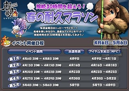 ■『鬼魂』 鬼魂春の耐久マラソン 概要 イベント期間 : 2007年4月6日(金)〜2007年5月6日(日) 上記日程におきまして、横スクロールオンラインRPG『鬼魂』では、「鬼魂春の耐久マラソン」を開催いたします。「鬼魂春の耐久マラソン」では、毎週金曜日から日曜日にかけて、鬼魂のプレイ時間をカウントするイベントです。 ■ 鬼魂春の耐久マラソン 開催日程 | イベント実施日 | 当選者発表日 | アイテム支給日