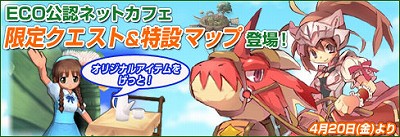 ■実装日 2007年4月20日(金)定期メンテナンス終了後 ■ECO公認ネットカフェ専用クエスト ECO公認ネットカフェの店内から、対象パソコンでECOをプレイしている方のみ参加可能な専用クエストをご用意しております。専用クエストを達成することにより、ネットカフェ限定のアイテムを始め、貴重なアイテムを獲得することができます。ネットカフェ専用クエストはクエスト残り数を消費しないため、いつでも気軽にお近くの公認ネットカフェでクエストに参加することが できます。 ◇「天空のオープンカフェ」 ECO公認ネットカフェを利用されているプレイヤーの皆様のコミュニケーションの場として「天空のオープンカフェ」マップを実装いたします。ここには使用料が無料の倉庫やECO公認ネットカフェ専用クエストの受付など便利なサービスをご用意しております。 ※ECO公認ネットカフェ内の対象パソコンからログインされているプレイヤーのみ入店無料となります。 ※ECO公認ネットカフェ内の対象パソコン以外からログインされている方は入店時に500Goldが必要となります。 ■専用クエストの達成で手に入るアイテム(一部) ・ネットカフェ限定アイテム「ウェイトレスの服(空色)♀」 ・ネットカフェ限定アイテム「アンティークワゴン」 ・「しましまオーバーニーEX」 ・「うわばき」 ・「あこがれのセーラー」 ・「サングラス(ミラー)」 ・「レジ」 ・「クリームソーダ」 など ※この他にも各種人気のアイテムが景品として登場します。景品は定期的に入れ替わるため、何がもらえるかはクエストをクリアしてからのお楽しみ! ■ECO公認ネットカフェリスト ガンホーゲームズ内ネットカフェページで、ECO公認ネットカフェが確認できます。 (店舗リストにECOロゴが表示されているお店がECO公認ネットカフェとなります) ◇ネットカフェTOP [URL]◇ECO公認ネットカフェTOP [URL]------------------------------------------------------- ▼詳細は、本日更新のECO公式サイトにてご確認ください。 [URL]