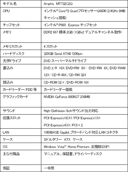 Amphis MT732C2Q グラフィックスカード:「GeForce 8600 GT」搭載製品(グラフィックスメモリ256MB) HDD容量:320GB OS:Windows Vista Home Premium 価格:19万9980円(税込)
