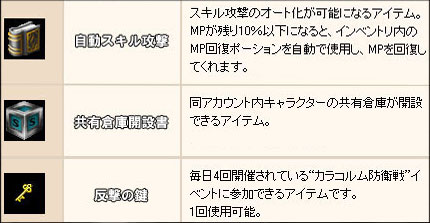 正式サービスでは,さまざまな便利アイテムをNPCから購入できる「プレミアムサービス」がスタートする。 プレミアムサービスを利用するには,シェアーズが運営する「share-city」で「SP」(Shares Point)を購入し,そのSPをゲーム内の「CASH」と交換しておく必要がある。 販売されるアイテムは,スキル攻撃の自動化とオートMPポーション機能が付いた「自動スキル攻撃」,1アカウントの複数キャラクターで共有可能な倉庫を開設できる「共有倉庫開設書」,特殊マップ「カラコルム防衛戦」参加用のアイテム「反撃の鍵」など。