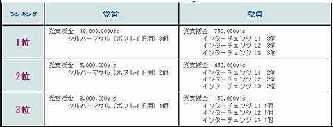 ■ 新大陸の王になる! 2. 説明 1週間ごとにランキングページでの上位3党の党首と党員にステキなアイテムをプレゼントいた します。 3. アイテム獲得資格 (1) ワールド別ランキング上位3党 (2) 一度ランキングに入った党は次回からプレゼント対象となりません(繰上げでプレゼント) ※ 党員キャラクターレベル・キャラクター数、党員数によって順位が変動 ※ 毎週ログインデータはクリアされます ※ アイテムが支給される前に脱党した場合、アイテムは支給されません。 4. アイテム内容