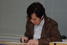 (左)一人一人に丁寧にサインを書く水木一郎さん