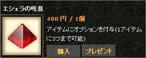 ●エシェラの吐息 効果:装備アイテムに特殊効果を1つ付与します。 ※特殊効果は、1つのアイテムにつき3つまで付与できます。 ※特殊効果の内容はランダムとなります。 ※アイテムへの特殊効果の付与は、そのアイテムに付与されている特殊効果数によって成功率が変化します。 1つ目の特殊効果付与の成功率 : 100% 2つ目の特殊効果付与の成功率 : 50% 3つ目の特殊効果付与の成功率 : 50% ※装備アイテムに使用する場合は、特殊効果を付与したいアイテムのみをキャラクターに装備させた状態で、エシェラの吐息を使用する必要があります。