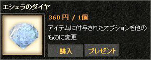 ●エシェラのダイヤ 効果:エシェラの吐息によって付与された特殊効果を変更します。 ※エシェラの吐息によって付与された特殊効果が3つある状態でのみ使用可能です。 ※特殊効果の変更内容はランダムとなります。 ※装備アイテムに使用する場合は、特殊効果を変更したいアイテムのみをキャラクターに装備させた状態で、エシェラのダイヤを使用する必要があります。