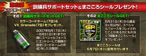 期間中、スペシャルフォースにエントリーして部隊の設定(コードネームの作成)された方に、もれなく「訓練兵サポートアイテムセット」を、また同期間中、ゲームに1 度以上ログインされた方にスペシャルフォース特製『まごころシール』をプレゼント致します。