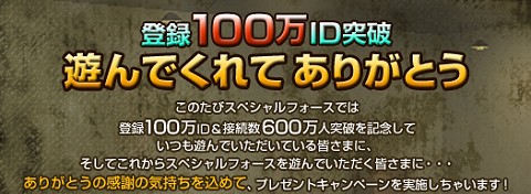 会員登録者数100 万&接続数600 万人突破を記念して、いつもスペシャルフォースを遊んでくれている皆さまに、そしてこれからスペシャルフォースを遊んでくれる皆さまに、ありがとうの気持ち を込めて、ありがとうキャンペーンを実施致します。