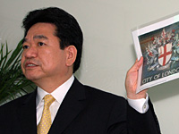 報道関係者向け事前説明会で登壇した,日本AMD マーケティング本部 プロダクトマーケティング デスクトップ・モバイルプロダクトマネージャー 土居憲太郎氏(左),と,同社ジャパンエンジニアリングラボ(JEL)所長 福井健人氏(右) 。福井氏は架空の動物であるGriffinについて,資料を手に説明していた