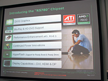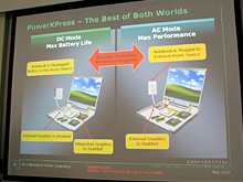 なお,PowerXpressをATI Mobility Radeonが利用できるのは言うまでもないとして,GeForce Mシリーズでも利用できるのかは気になるところだ。その点について聞いてみると,「PCI Express接続なので,RS780Mの外部GPUとしてGeForceを利用することはできる。しかし,PowerXpressはRS780Mの機能であり,旧ATI Technologies製GPUとの組み合わせでサポートされることになる」という答えが返ってきたことは,付記しておきたいと思う。