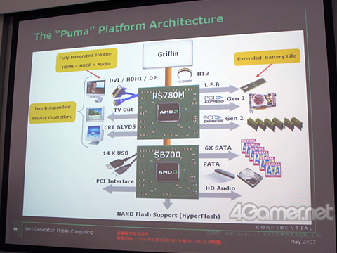 2007年5月18日,AMDは次世代モバイルCPUとプラットフォームを,2008年中頃に市場へ投入すると発表した。開発コードネームは,CPUが「Griffin」(グリフィン),プラットフォーム名が「Puma」(プーマ)となる。 GriffinとPumaは,2009年のリリースに向けて開発が進められている,GPU(グラフィックスチップ)統合型CPU「Fusion」ベースのノートPCに向けた第3のステップとされ,その中間点として,GPU(グラフィックスチップ)との“付き合い方”に,一つの動きがあった。また,消費電力低減に向けての方策もいくつか打ち出されたので,現時点で明らかになった内容を,ざっとまとめてみることにしたい。