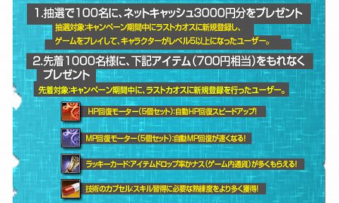 先着1000名様にラストカオスゲーム内で使用できる便利なアイテム700円相当を。また、ゲームをプレイしてレベル5を達成したユーザー様を対象に、抽選で100名様に3000 NET CASH(3000円)をプレゼントいたします。こちらの3000 NET CASHはラストカオスのポイントではなく、ネットキャッシュそのものでのプレゼントとなります。