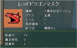 【アイテム詳細】 アイテム名: (選択カラー)ドラゴンマスク 種類: 1周年記念アイテム 装備可能職業: 全職業 装備可能レベル: 1 売却価格: 1 防御力: 15 魔法抵抗: 0 回避率: 2