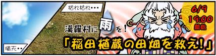 ●「稲田植蔵の田畑を救え!」イベント詳細( [URL]) 雨が降らず、田畑の稲や野菜が枯れてしまうことを恐れているお百姓「稲田植蔵」の依頼を聞き、助けてあげましょう。 無事、助けることができれば、アイテムドロップ率50%UPの報酬があります。 ■稲田植蔵からの依頼内容 「水の精霊」の出現場所周辺で、広告文を【お供え物】に、出品している全てのアイテムの単価を1000両以下に設定して個人商店を開いてください。水の精霊はお供え物と判断し、アイテムを購入します。 お供え物で水の精霊の機嫌が良くなり、雨が降るようになれば、稲田植蔵からお礼があります。 また、水の精霊が喜ぶお供え物をした場合、水の精霊から素敵なプレゼントがもらえるかもしれません。