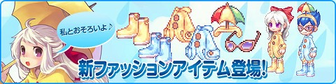 6月5日(火)のメンテナンス終了後から、新しいファッションアイテムの販売を行います。 梅雨のこの季節にピッタリのカッパや長靴、ちょっと変わった形の傘をはじめとし、みずたまがポイントの季節を感じさせるチューブトップやヘアバンドやニーソックス、コーディネイトのキーアイテムとなるジーパンなどのキュートなファッションアイテム全18種類を追加いたします。 梅雨から初夏にかけてのファッションにピッタリのこれらのアイテム、ぜひゲットしてじめじめと憂鬱な気分を吹き飛ばしてしまいましょう! | 服(全身) | 35LP | ひよこカッパ | キュートな黄色いカッパ | | 服(全身) | 35LP | 空模様カッパ | キュートな水色のカッパ | | 靴 | 16LP | ひよこ長靴 | キュートな黄色い長靴 | | 靴 | 16LP | 空長靴 | キュートな水色の長靴 | | 帽子 | 18LP | 傘形帽子 | 雨の日にかぶる可愛い帽子 | | 耳飾り | 16LP | チェリーロングイヤリング | チェリーの実が付いているイヤリング | | メガネ | 21LP | レッドリゾートグラス | 南国のリゾート気分が味わえる爽やかなサングラス | | アクセサリ | 16LP | レッドリゾートブレスレット | 南国のリゾート気分が味わえる爽やかなブレスレット | | 服(上) | 28LP | 紫ノースリーブ(男) | タフで男性らしいノースリーブシャツ | | 服(上) | 28LP | レッドノースリーブ(男) | タフで男性らしいノースリーブシャツ | | 服(上) | 28LP | ブルーリボンチューブトップ(女) | 可愛いリボンが付いているチューブトップ | | 服(上) | 28LP | ピンクリボンチューブトップ(女) | 可愛いリボンが付いているチューブトップ | | 服(下) | 29LP | ブルーロールアップジーパン | スポーティな感じのタイトデニム | | 服(下) | 29LP | ピンクロールアップジーパン | スポーティな感じのタイトデニム | | 帽子 | 24LP | ピンクハートヘアバンド | 大きい衣のハートが可愛いヘアバンド | | 帽子 | 24LP | オレンジハートヘアバンド | 大きい衣のハートが可愛いヘアバンド | | 靴 | 21LP | カラーチェックスニーカー | チェック模様がかわいらしいスニーカー | | ソックス | 16LP | ピンク水玉模様ニーソックス | ピンクの水玉模様のニーソックス | | | 63LP | ひよこカッパセット | キュートな黄色いカッパのセット | | | 63LP | 空模様カッパセット | キュートな水色のカッパのセット |