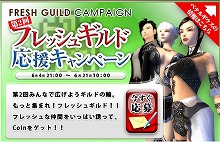 ◆キャンペーン概要 今回の第2回フレッシュギルドキャンペーンは、<カペラ><アルデバラン>の2ワールドにおいて開催致します。 レベルの高さにこだわらず、大人数でワイワイギルドを楽しみたいという方、新しいメンバーを迎え入れてギルドを大きくしたい方などを対象に、レベル40以下のフレッシュなメンバーのいる、ギルドを大募集いたします。 キャンペーンにご応募を頂いたギルドマスター様には、レベル40以下のメンバー全員のレベルの合計値×10000coinを差し上げます。 キャンペーン詳細はこちら⇒( [URL]) ◆募集期間 2007年6月4日(月)〜2007年6月21日(木) ◆キャンペーン対象ワールド カペラワールド アルデバランワールド ◆賞品 ギルド内のレベル40以下のメンバー全員のレベルの合計値×10000coin ※レベル41以上のギルドメンバーのレベルは賞品として計測される合計値内に含まれません。 ※賞品のコインは、ゲーム内メールにてお渡しします。 ◆応募資格者 <カペラ><アルデバラン>の両ワールド内の、ギルドのギルドマスター様 ◆応募方法 ご応募はメールのみとさせて頂きます。 -応募先- 【fresh_guild@cc-media.co.jp】 -応募メール記入事項- メールタイトル:第2回フレッシュギルド応援キャンペーン メール本文: 1.MK-ID 2.キャラクター名 3.ワールド名 4.ギルド名 5.レベル40以下のメンバー全員のレベル合計値 ※「ギルドメンバー」と「メンバーのレベル」を判別するため、ギルドウィンドウのスクリーンショットを添付して下さい。 ※ご応募の際、添付ファイルはjpegもしくはgifファイルのみの受付となります。それ以外のファイルで送られた場合、失格となります。 ※必要事項が未記入の場合や、スクリーンショットが添付されていない場合、応募を受け付けることができませんので、記入漏れ、添付忘れのないようお願いいたします。