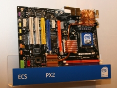 X38はもともとDDR3 SDRAMのみ対応で,DDR2 SDRAMをサポートする予定はなかったようなのだが,COMPUTEXの会場には,Universal abitの「IX38 QuadGT」,ECSの「PX2」,GIGA-BYTE TECHNOLOGYの「GA-X38-DQ6」など,DDR2 SDRAM対応モデルも多数展示されていた。 Intelの関係者によれば,「X38に関してOEM/ODMベンダー(※編注:PCメーカーのこと)やマザーボードベンダーから,DDR2 SDRAMサポートを強く求められたことで,対応を進めた」とのことで,最新の製品概要によると,DDR2 SDRAMも公式サポートに加えられている。