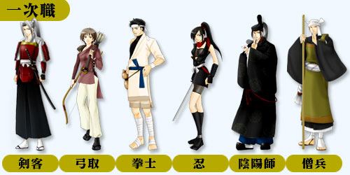職業について ・職業は、最初は基本職の無職となります。一定のレベルに達すると二次職・三次職(実装時期Cβ以降)へクラスチェンジ可能です。 一次職:剣客、拳士、弓取、忍、僧兵、陰陽師 ・職業の他に、各キャラクターは出自(出身)を選ぶことができます。物語の進行過程で能力や使用できるスキルに変化が出てきます。 ・出自(出身)の中にはアイテムや武具の精製を得意とするもの、開拓や生産を得意とするもの、流派を開設できるもの等が存在します。(実装時期Cβ以降)