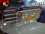 Acceleroシリーズを展開し,Tul(PowerColor)製グラフィックスカードで採用されていることでも有名なArctic Coolingの新製品は「Accelero Xtreme」。GPUと接触する銅製の枕から伸びる5本のヒートパイプが,2ピース構成で107枚のフィンからなるヒートスプレッダへとつながっていて,さらにそれを3連の80mm角ファンで冷却するという,2スロット構成を採っている。 同社のマーケティングマネージャーであるPatrick Chung氏によると,今回展示しているのはプロトタイプであり,2007年8月の発売に向けて鋭意開発中。そのため,まだ詳細な仕様や価格,他製品との比較データなどは出せないとのことだったが,「3基のファンを利用するから,1基のときよりもファン回転数が下げられるうえ,冷却能力も高められる。だいたい,どう見ても冷えそうだろう?」(Chung氏)と自信満々だったので,期待していいかもしれない。