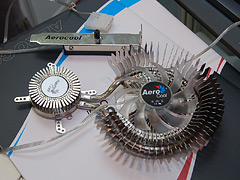 GPUクーラーから離れたところにあるヒートスプレッダに2本のヒートパイプで熱を送り,ヒートスプレッダ部のファンで冷却するユニークな形状になっていたのが,Aerocoolの「Double Power」である。 対応してくれたブース担当者が,それほど製品に詳しくなかったため,対応GPUについて最初は「AMDとNVIDIAのほとんど」という回答しかしてくれなかったのだが,少なくとも両社のハイエンドモデルはサポートしているそうなので,GeForce 8800 GTXやATI Radeon HD 2900 XTはサポートされていると見ていいだろう。ブース担当者いわく「製品名を忘れてしまったが,内部テストではZalman Techの何とかというクーラーよりも冷えた」そうで,なんとも頼りないが,少なくとも製品のデキに開発者レベルでは自信がある様子だった。