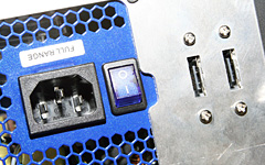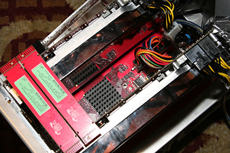 16レーンのPCI Express信号を,写真中央に見えるヒートシンクの下に用意されたPXIコントローラで48レーンに増幅。Lassoではこれを2本のスロットにx16として分配する。理論的にはPCI Express x16スロットを3本搭載することも可能で,筐体は2スロット仕様のカードを4枚搭載できるだけの余裕を持っている。ちなみに差さっていたのは「ATI Radeon HD 2900 XT」カード×2